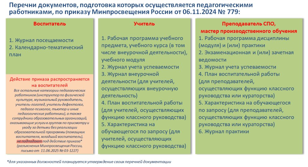 Поручение о снижении бюрократической нагрузки на учителей дано Правительством Российской Федерации в 2022 году. Ведомством, ответственным за координацию работы в данном направлении и контроль, определена Федеральная служба по надзору в сфере образования и науки (Рособрнадзор). С 1 сентября 2022 года начал действовать перечень документации, подготовка которой осуществляется педагогическими работниками при реализации основных общеобразовательных программ (приказ Минпросвещения России от 21.07.2022 № 582). С 1 марта 2025 года действует приказ Минпросвещения России от 06.11.2024 № 779 «Об утверждении перечня документов, подготовка которых осуществляется педагогическими работниками при реализации основных общеобразовательных программ, образовательных программ среднего профессионального образования», который утвердил такие перечни документации для воспитателей и преподавателей организаций среднего профессионального образования. Президентом России В.В. Путиным по итогам заседания Совета при Президенте по науке и образованию, прошедшего 06.02.2025, дано поручение главам субъектов Российской Федерации реализовать комплекс дополнительных мер по выполнению требований законодательства об образовании в части, касающейся снижения бюрократической нагрузки на педагогических работников. В настоящее время вопрос снижения бюрократической нагрузки находится на постоянном контроле Председателя Правительства Российской Федерации М.В. Мишустина. В целях снижения бюрократической нагрузки на образовательную организацию действует ряд положений Федерального закона от 29.12.2012 № 273-ФЗ «Об образовании в Российской Федерации»: 1) образовательная организация вправе не предоставлять организациям, государственным органам и органам местного самоуправления информацию и документы при отсутствии указания в запросе правовых оснований (ч. 4 ст. 29, норма действует с 01.03.2025). 2) за образовательной организацией закреплено право применять в своей деятельности электронный документооборот, который предусматривает создание, подписание, использование и хранение документов, связанных с деятельностью образовательной организации, в электронном виде без дублирования на бумажном носителе (ч. 8 ст. 28, норма действует с 01.09.2022).